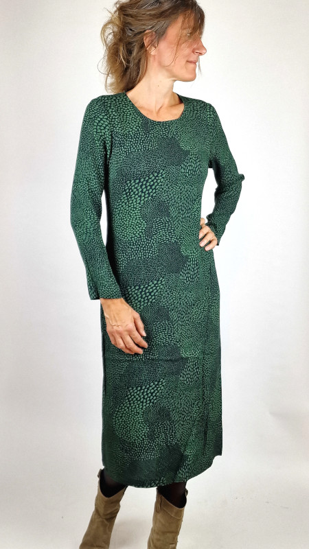 De basis van de jurk is donkerblauw en de print is uitgevoerd in groen.