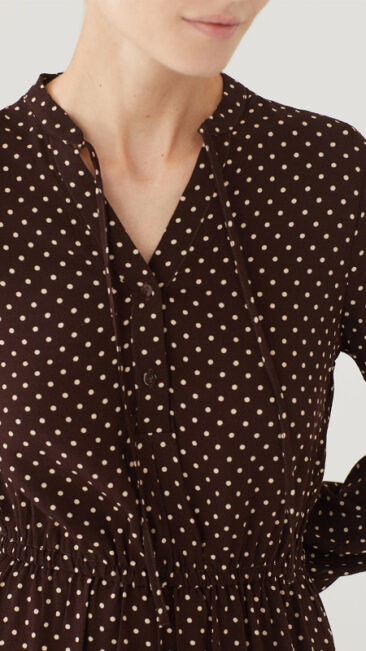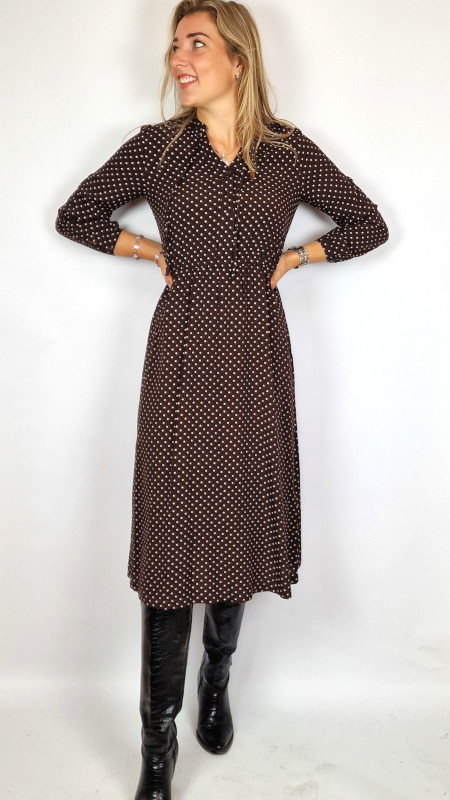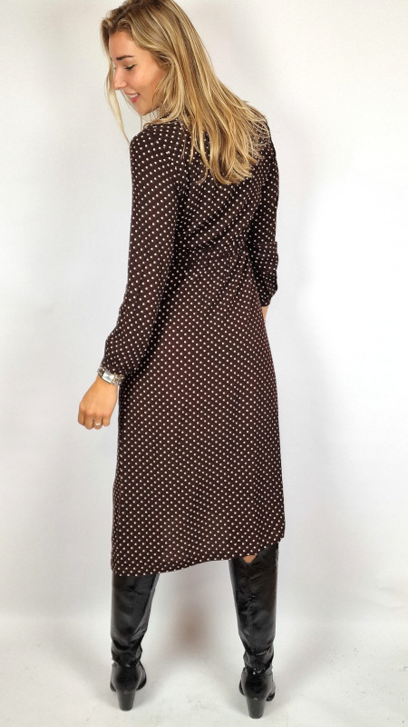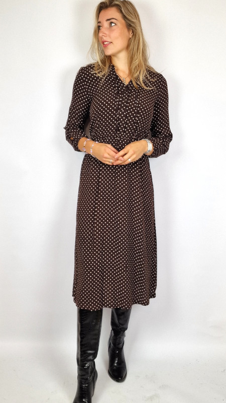 Donkerbruine Nice Things midi-jurk met all over stippenprint in offwhite.