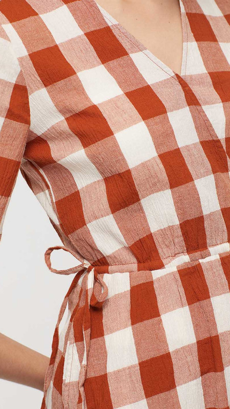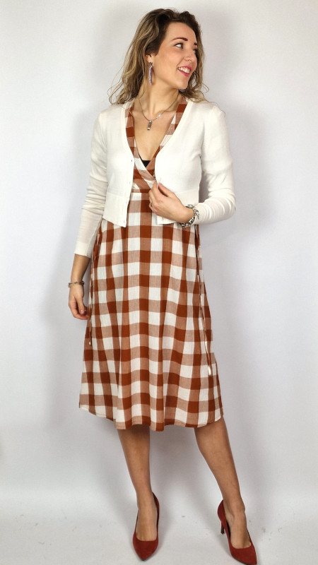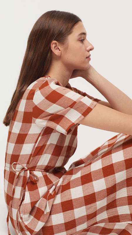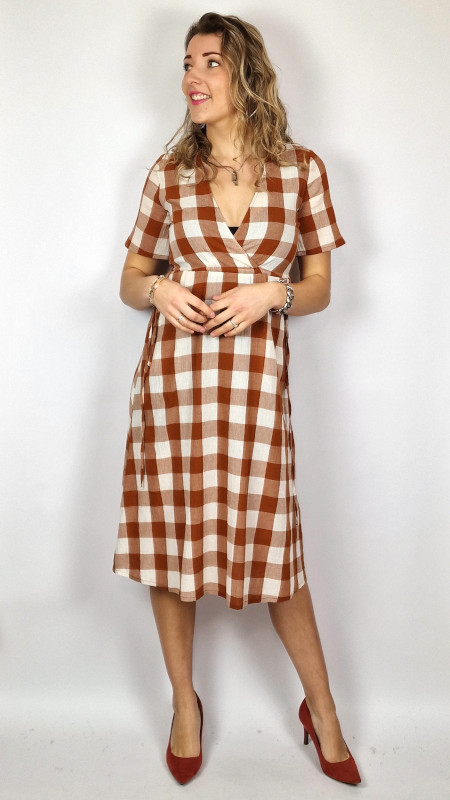 Nice Things midi zomerjurk met ruitprint in camel, lichtbruin en offwhite.