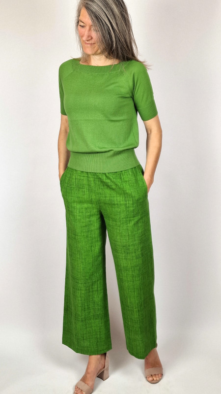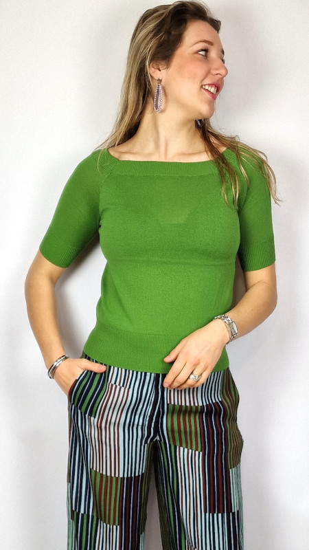 De top heeft een prachtige boothals, mouwen tot iets boven de elleboog en een brede boord aan de onderzijde.