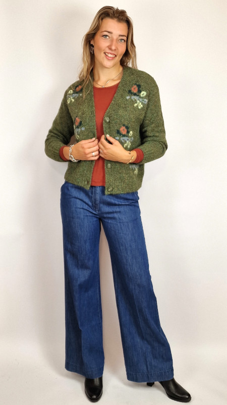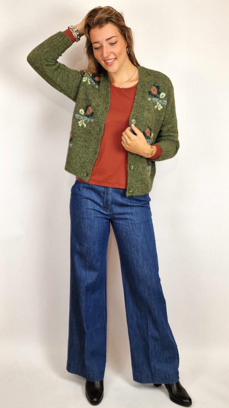 Op de foto’s zie je de perfecte combinatie met het Sorgenfri shirt Philia henna en een denim pantalon van Nice Things.