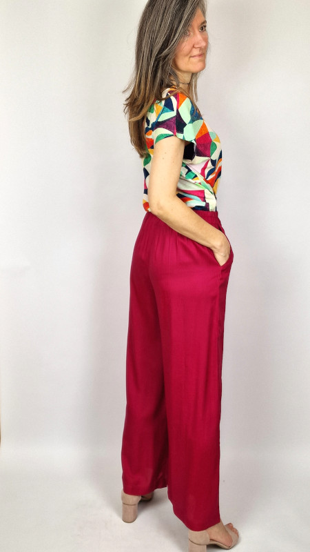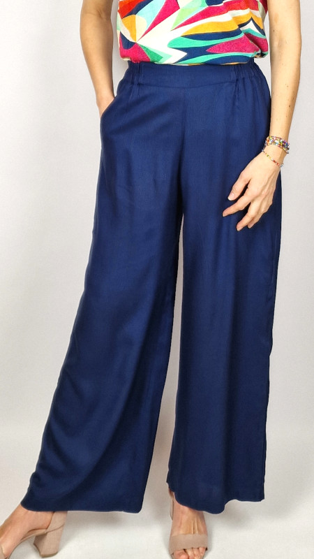 Soepele zomerbroek met elastische taille aan de achterzijde, steekzakken en wijde pijpen.
