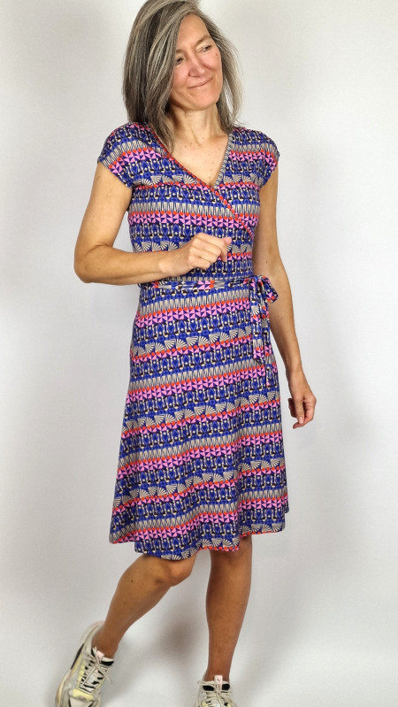 Met overslaghals, V-hals aan de achterzijde, een kort aangeknipt mouwtje, striklint in de taille en een A-lijn tot boven, op of net over de knie (afhankelijk van je lengte).