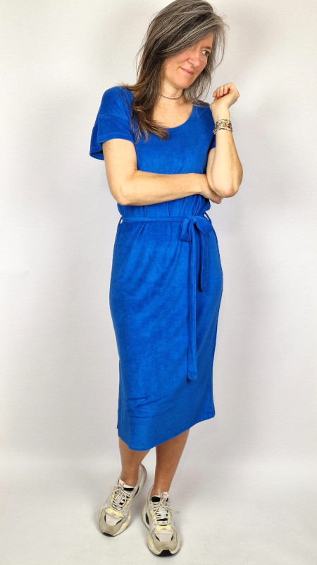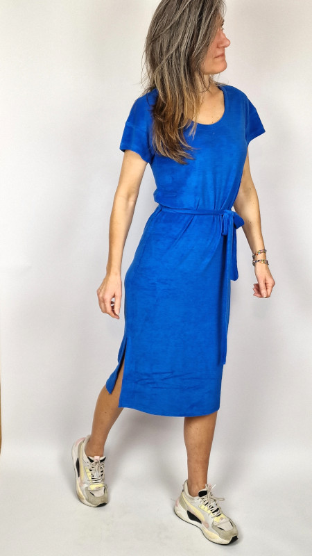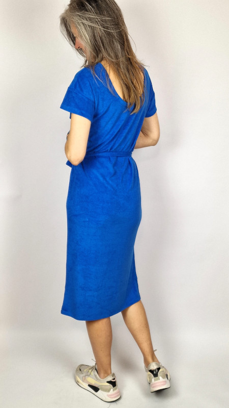 De jurk heeft korte mouwtjes en aan de voor- en achterzijde een diepe ronde hals.
