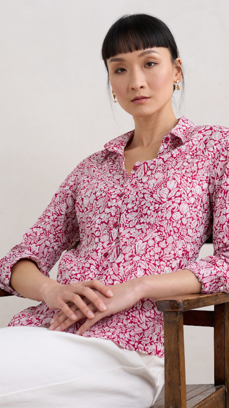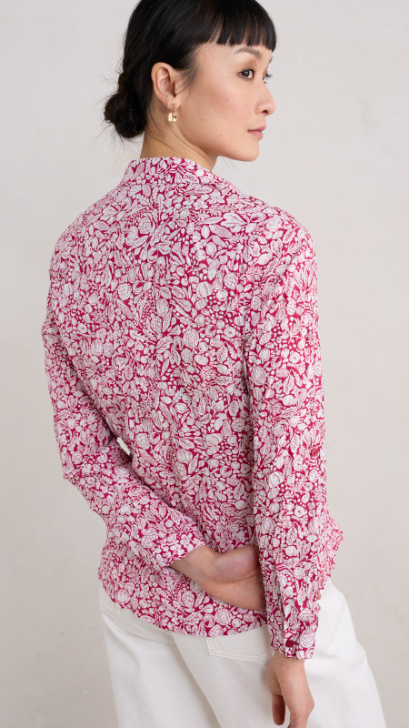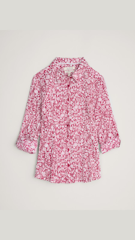 De mouwen kun je oprollen en met een bandje en knoopje vastzetten voor een pittige driekwart-look. Aan de onderzijde is de blouse rond genaaid met aan beide kanten een klein splitje.