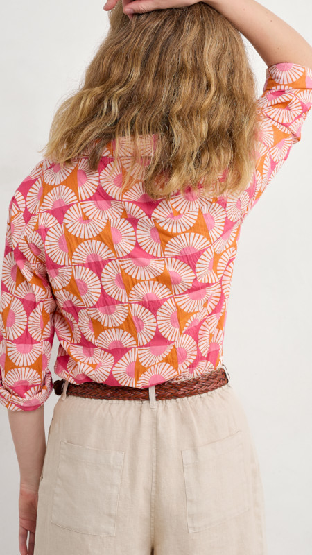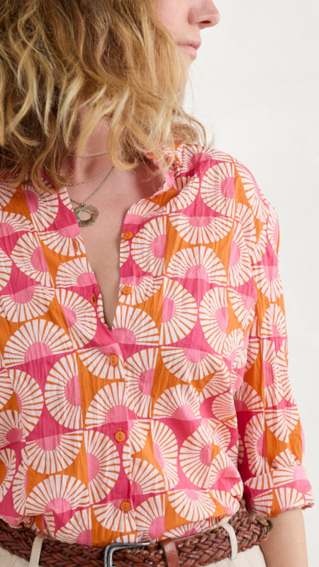 Roze Seasalt crinkle blouse met print in licht roze, brique en offwhite.