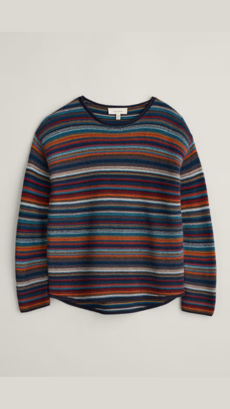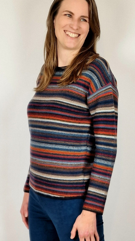 Gestreepte Seasalt trui in donkerblauw, lichtblauw, petrol, brique en roodtinten.