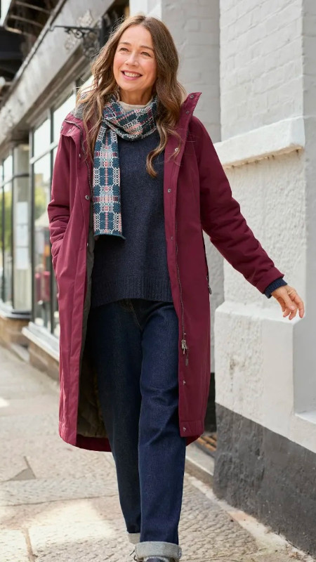 De jas is er ook in lichtblauw, donkerblauw, donkergroen en okergeel.
