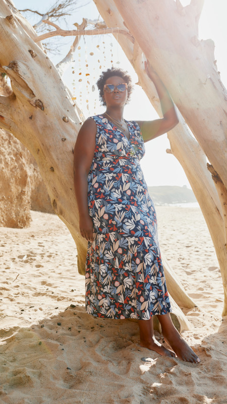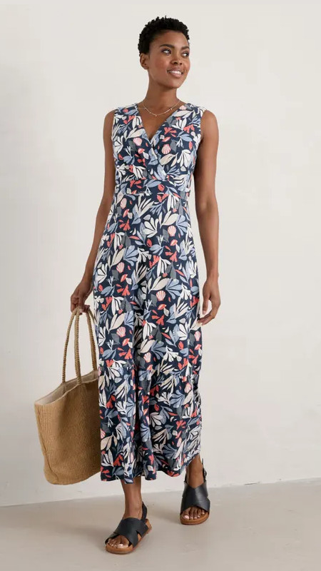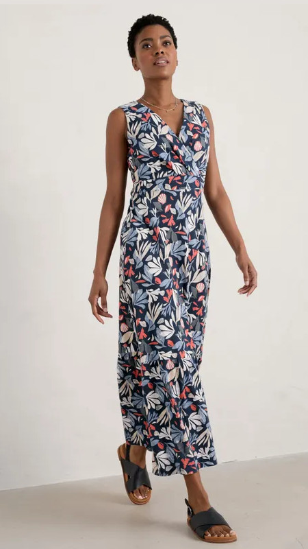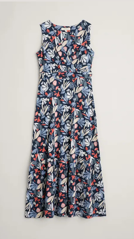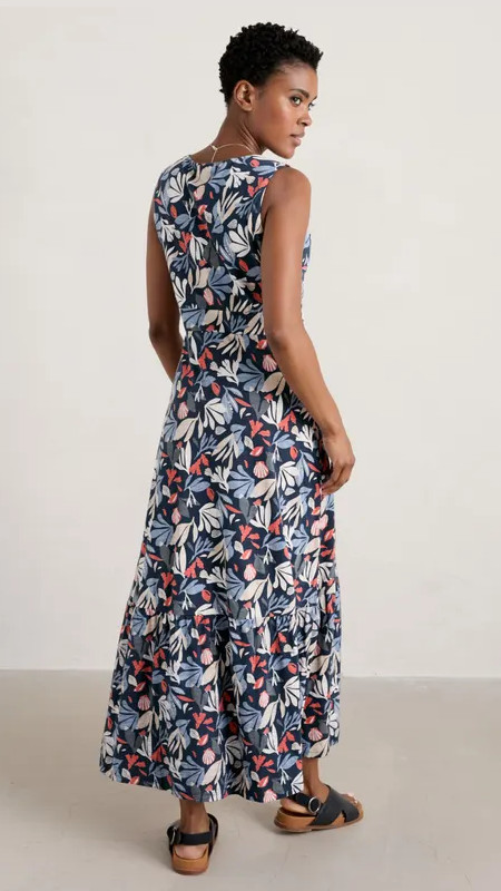 Lange donkerblauwe Seasalt jurk met print in lichtblauw, beige, wit en rood.