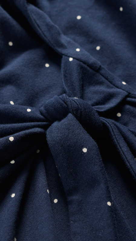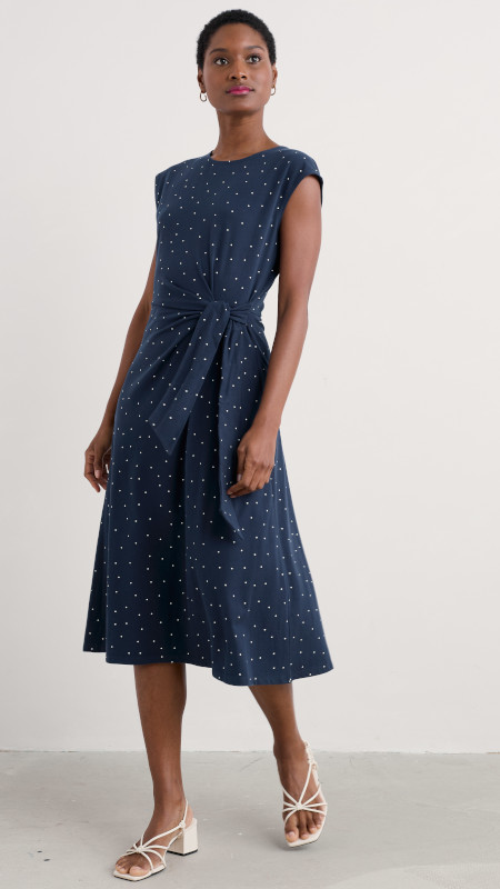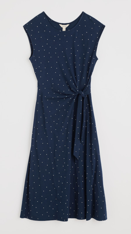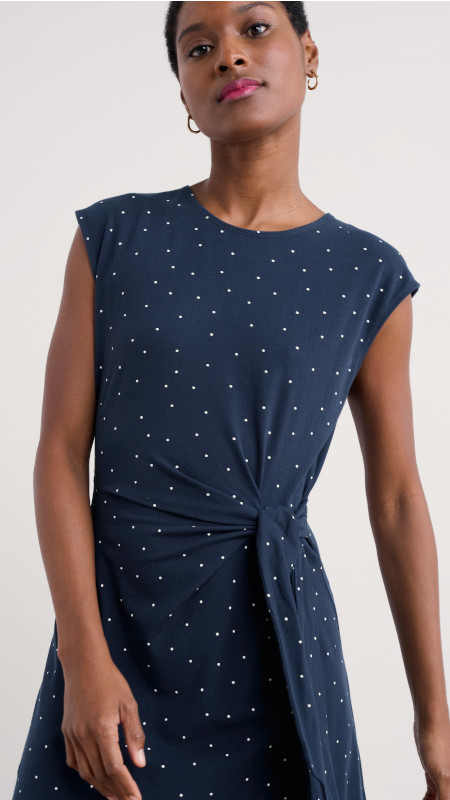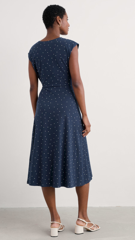 Donkerblauw polkadot Seasalt jurkje met een ronde hals en korte aangeknipte mouwtjes tot net over de schouder.
