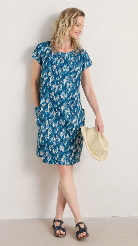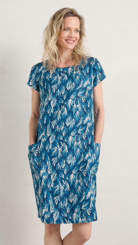 Seasalt jurk in blauw- en petroltintenSeasalt jurk in blauw- en petroltinten.