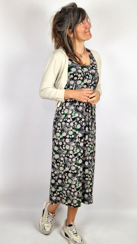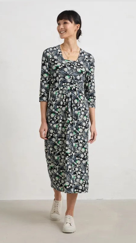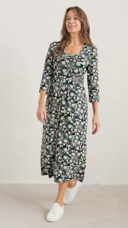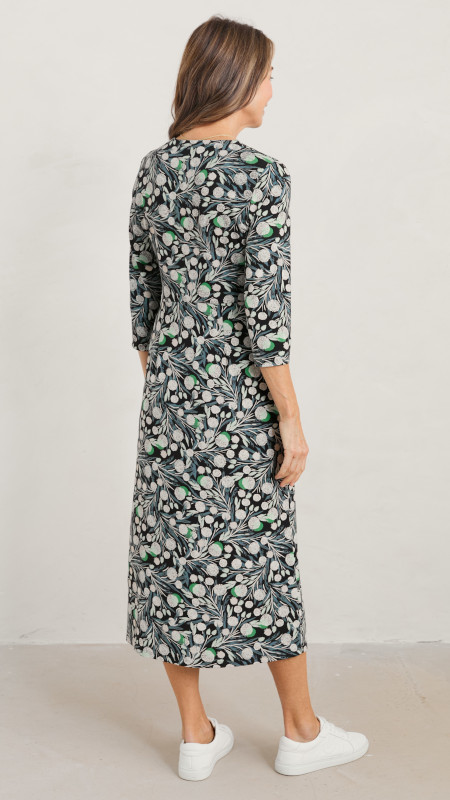 Zwarte Seasalt jurk in midilengte met print in beige, grijs en twee tinten groen.