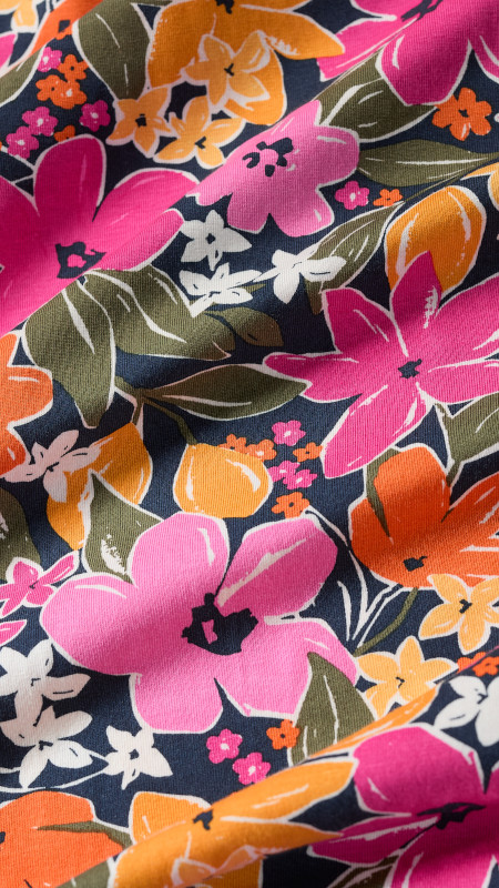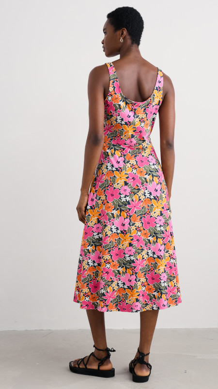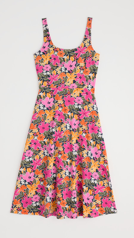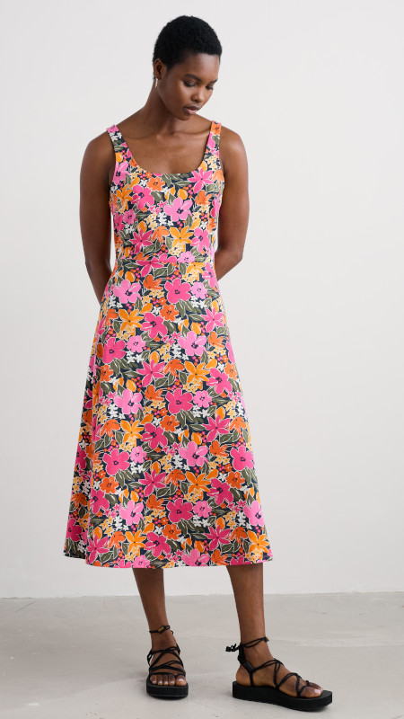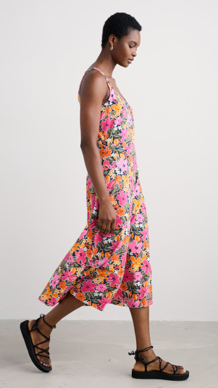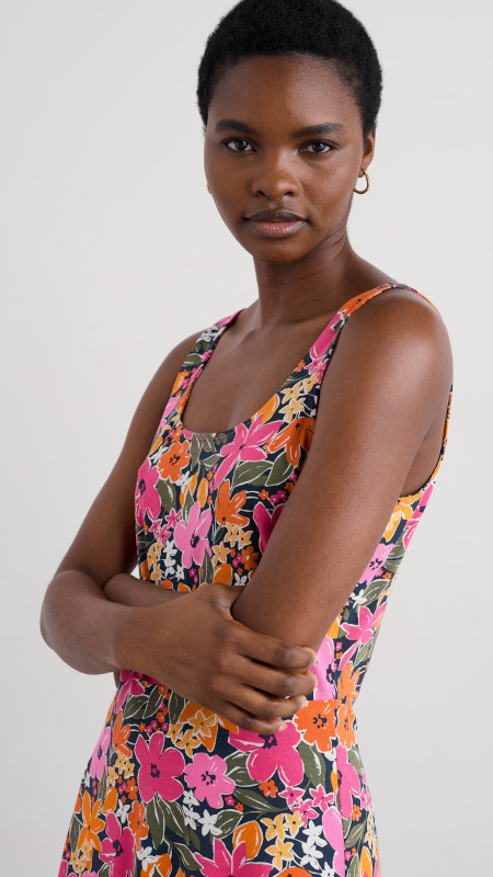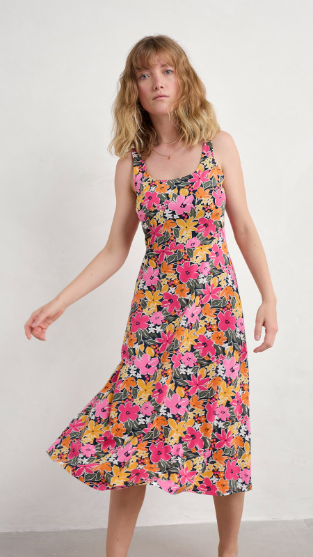 Mouwloze Seasalt zomerjurk met kleurrijke bloemenprint in roze, groen, wit, geel en oranje op een donkerblauwe basis.
