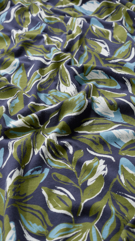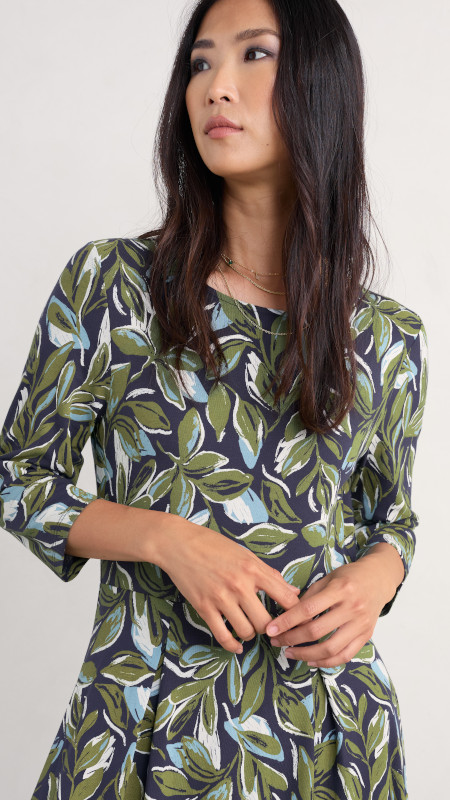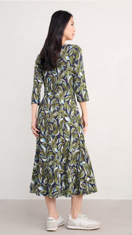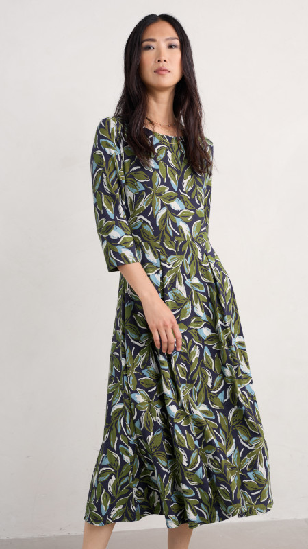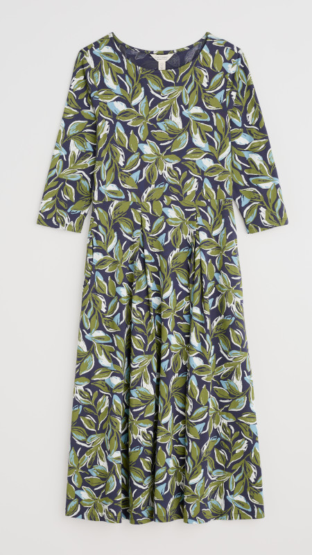 Midi Seasalt jurk in groen, lichtblauw en wit op een donkerblauwe basis.