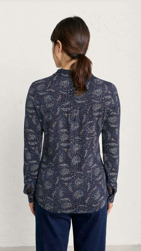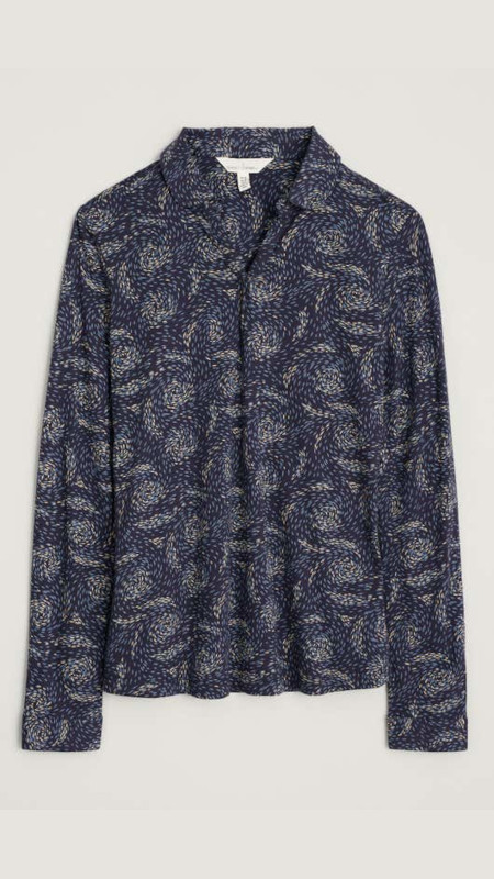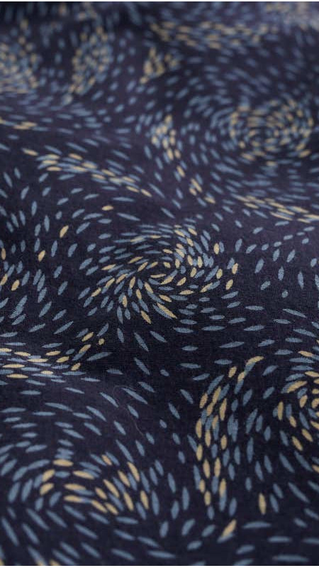 Het shirt is donkerblauw met een print van allemaal ronddraaiende kleine streepjes in lichtblauw en beige.