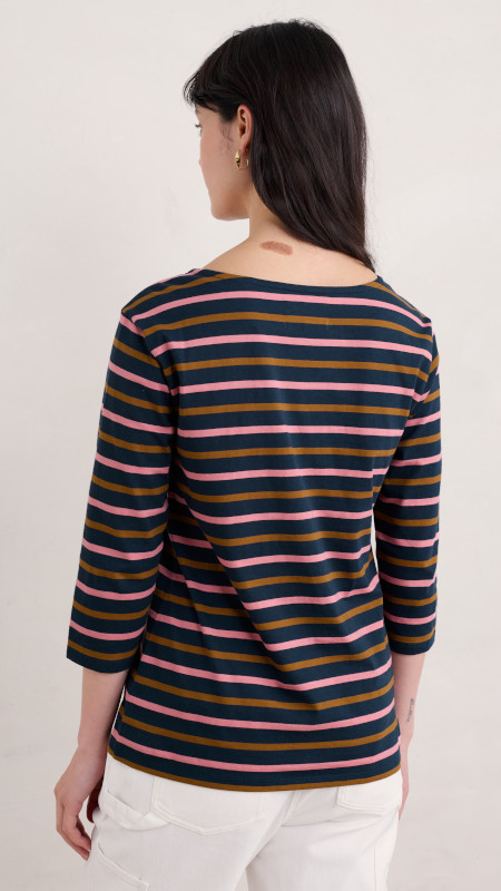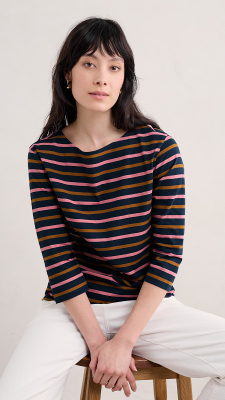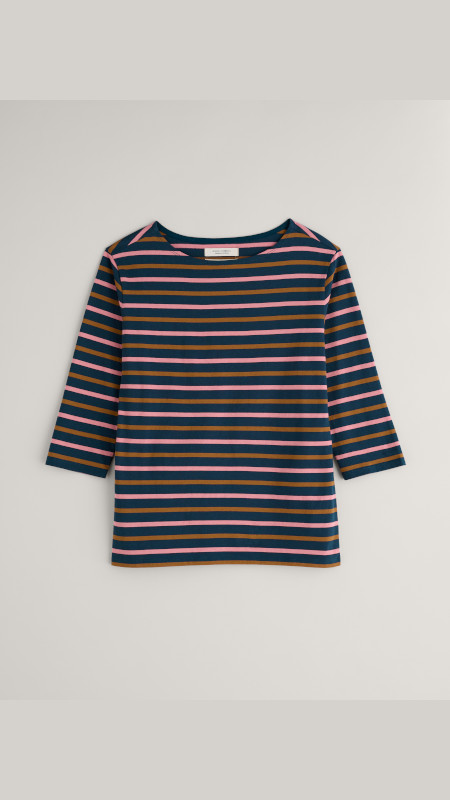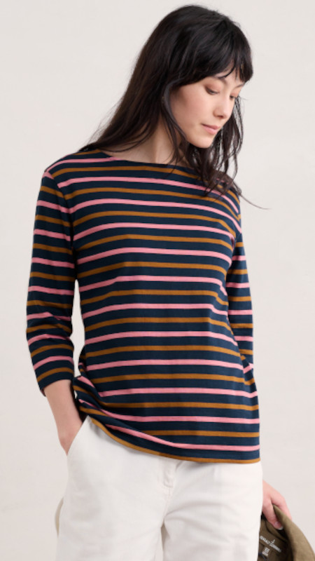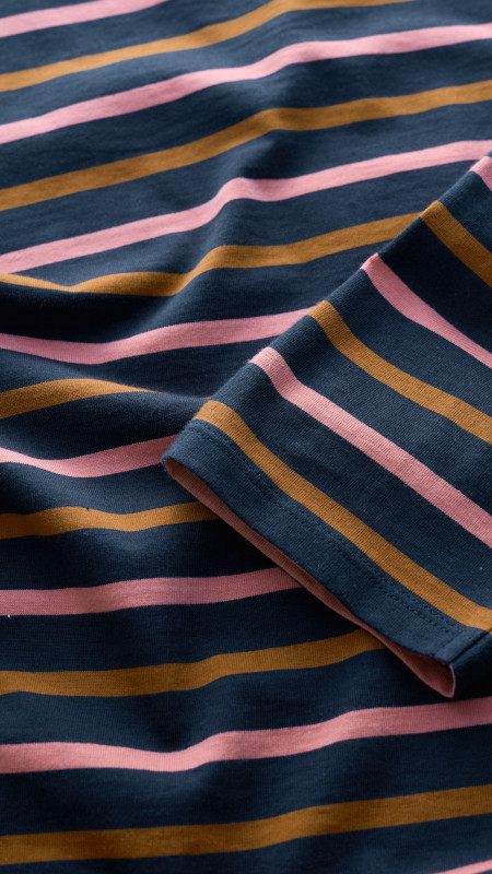 Gestreept Seasalt shirt in oud-roze en oker op een donkerblauwe basis.