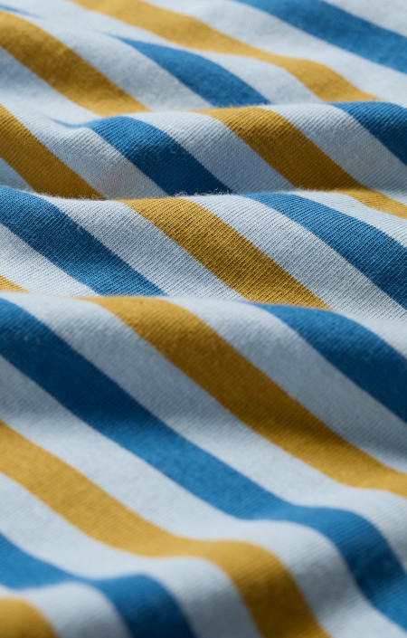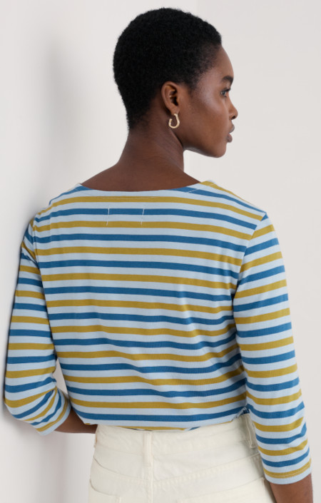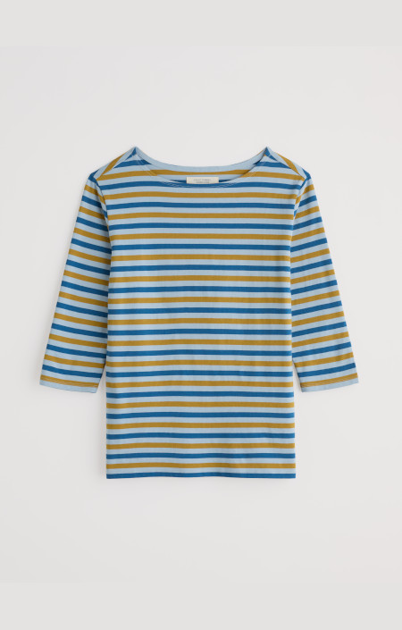 Gestreept Seasalt shirt met boothals, driekwart mouw in twee tinten blauw en okergeel.