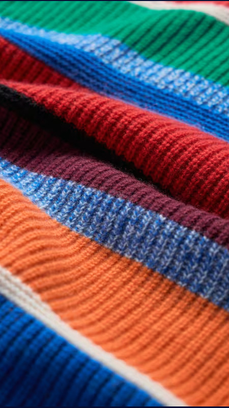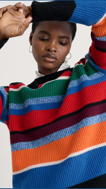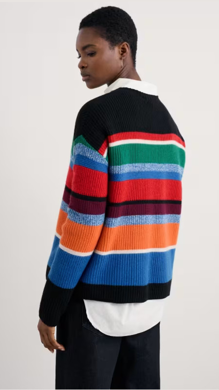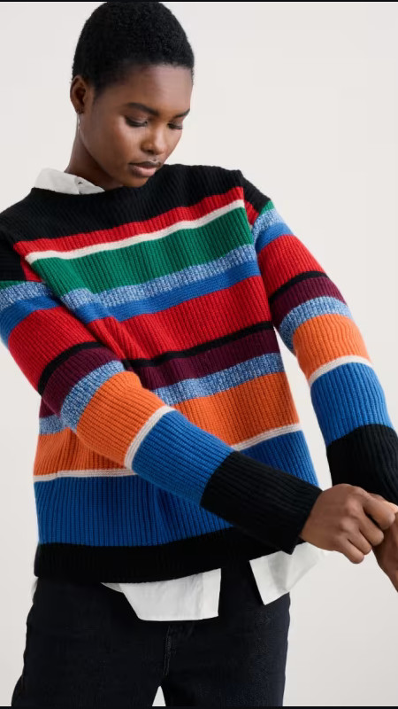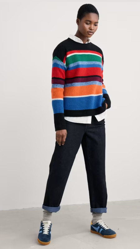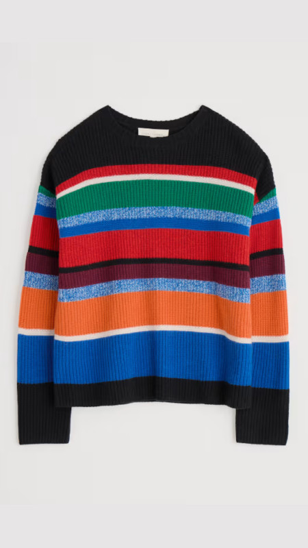 Vrolijke wollen Seasalt trui met streepmotief in heldere kleuren op een zwarte basis.