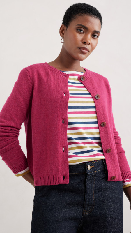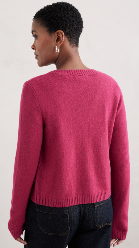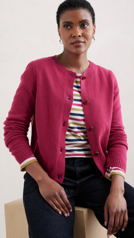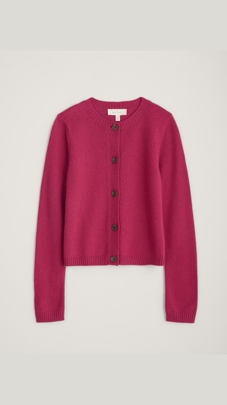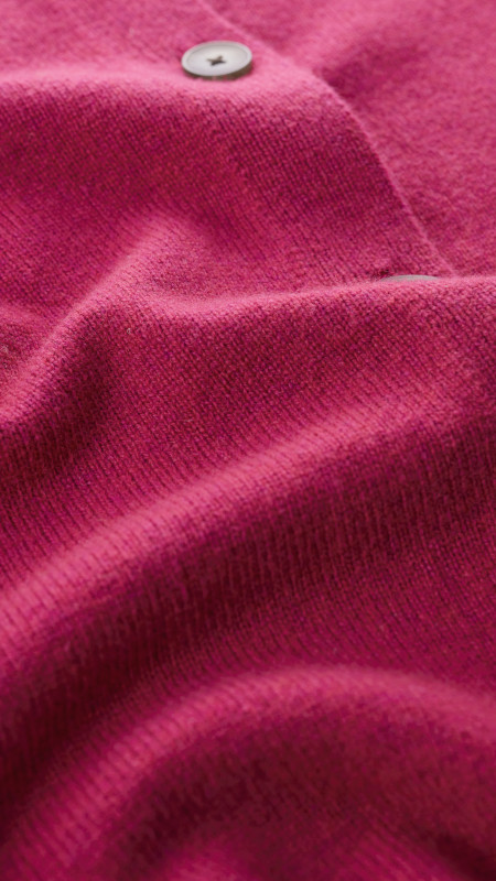 Dit vestje heeft een ronde hals, lange mouwen en bruine, gemarmerde knopen.