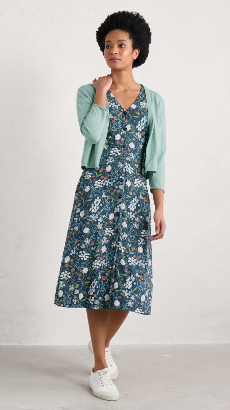 Op de foto’s wordt het vestje gedragen over de jurk Lilian sketched field light squid.