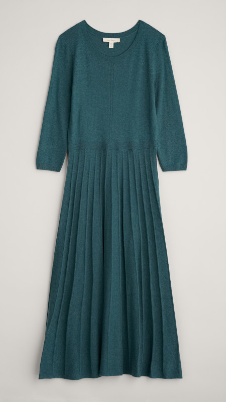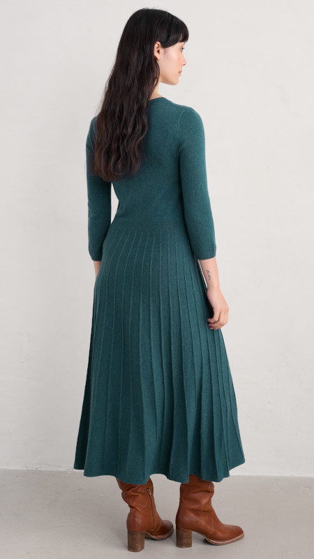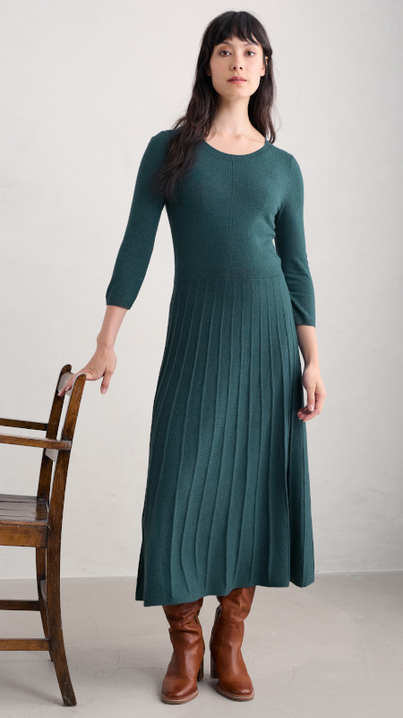 Grijsgroene gebreide Seasalt jurk met prachtig geplooid rokgedeelte.