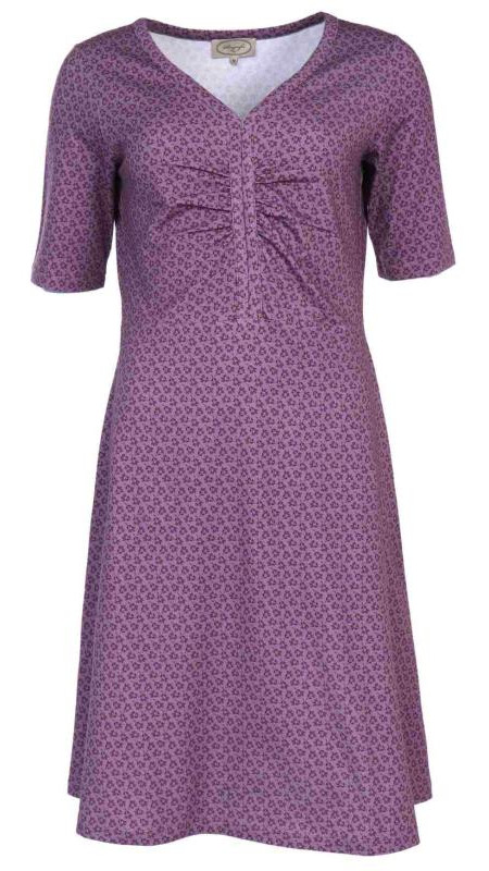 Lila Sorgenfri jurk met print van kleine bloemetjes in twee tinten donkerroze en een detail oker.