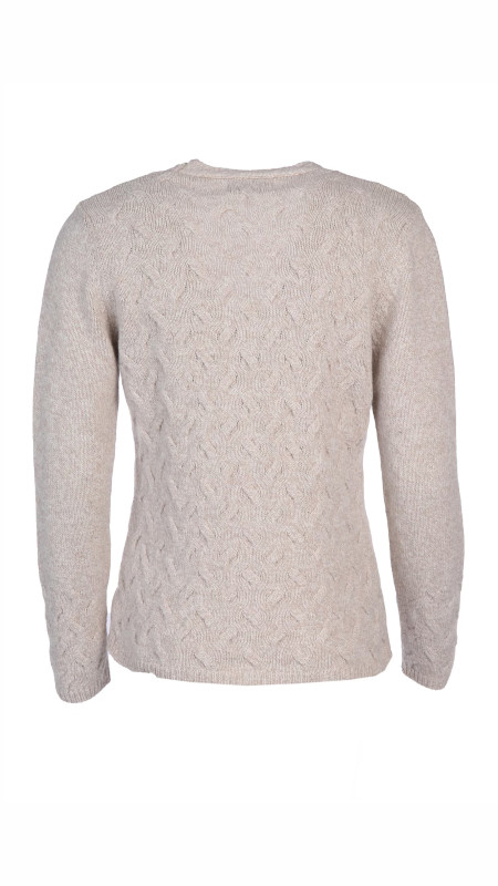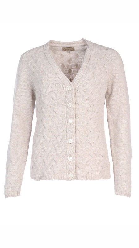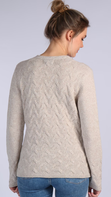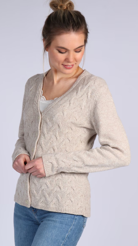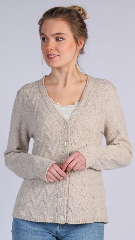 Dit vest is gebreid in een subtiel kabelpatroon op het voor- en achterpand; de mouwen hebben dit patroon aan de onderzijde.