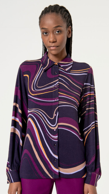 Donkerpaarse Surkana blouse met print in retro tinten.