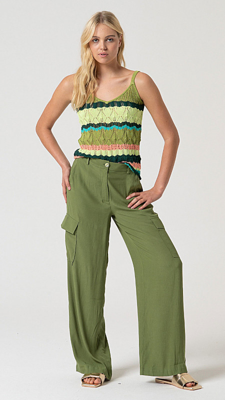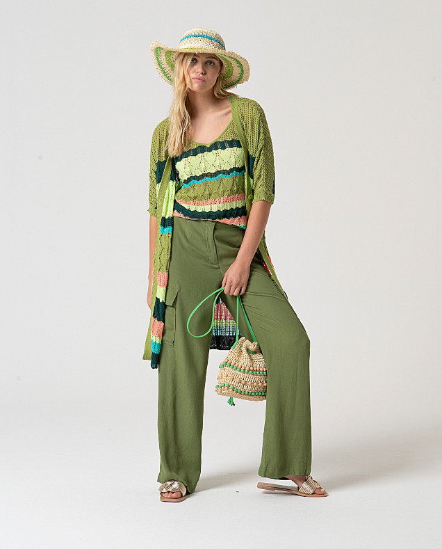 Superleuk in combinatie met het vest in hetzelfde materiaal en de groene cargo-broek van Surkana (foto’s 3 en 4).