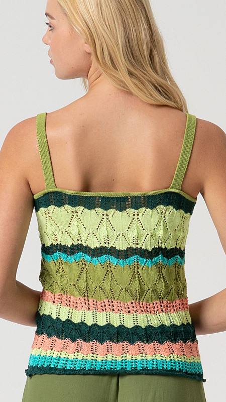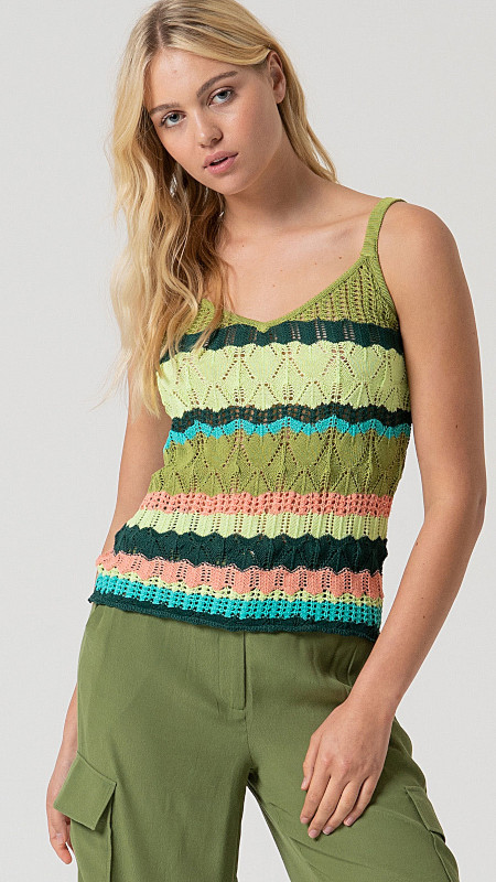 Gehaakte Surkana top met streeppatroon in licht- en donkergroen, roze en turquoise.