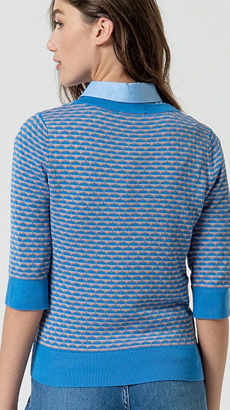Blauw Surkana truitje met motief in oranje en een lichtere tint blauw.