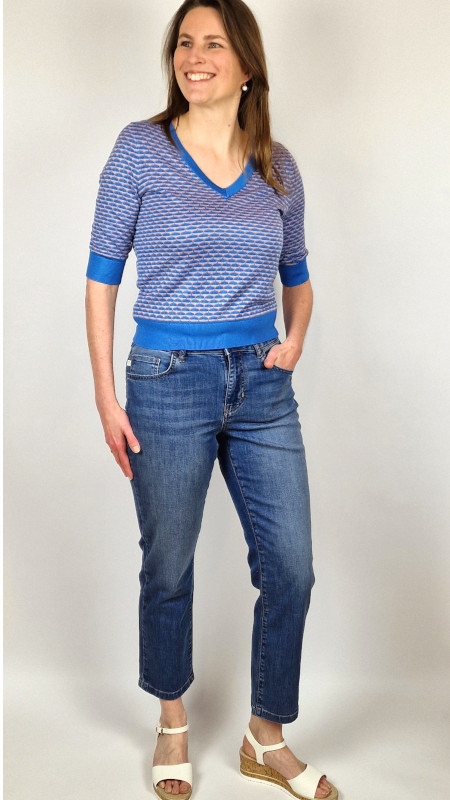 Het truitje heeft een diepe V-hals en mouwen tot op de elleboog.