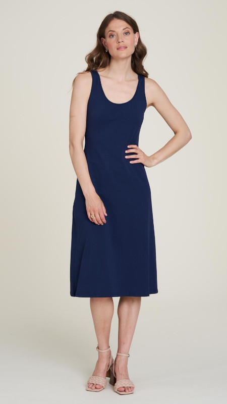 De jurk heeft een A-lijn rokgedeelte dat uitloopt tot over de knie.
