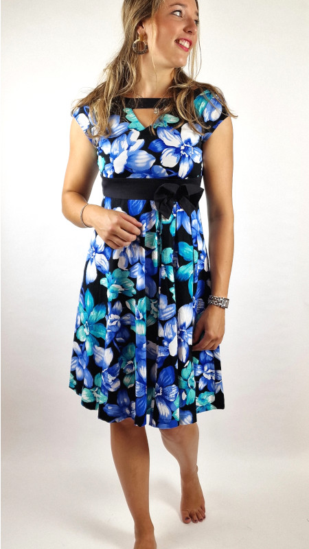 Vanuit de verhoogde taille loopt de jurk zwierig wijd uit tot net op of over de knie (afhankelijk van je lengte).
