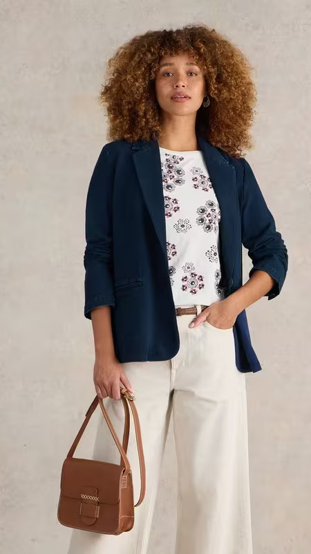 De blazer sluit met één knoop, twee zakken aan de voorzijde en de mouwen zijn mooi afgewerkt met een knopenrij.