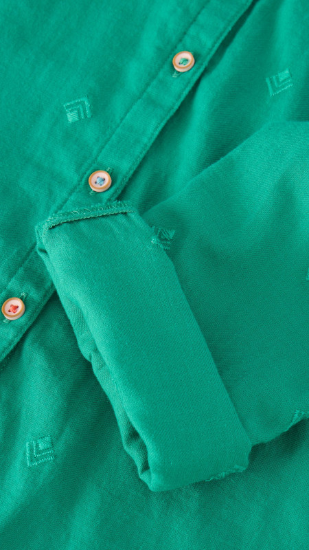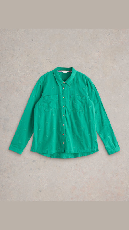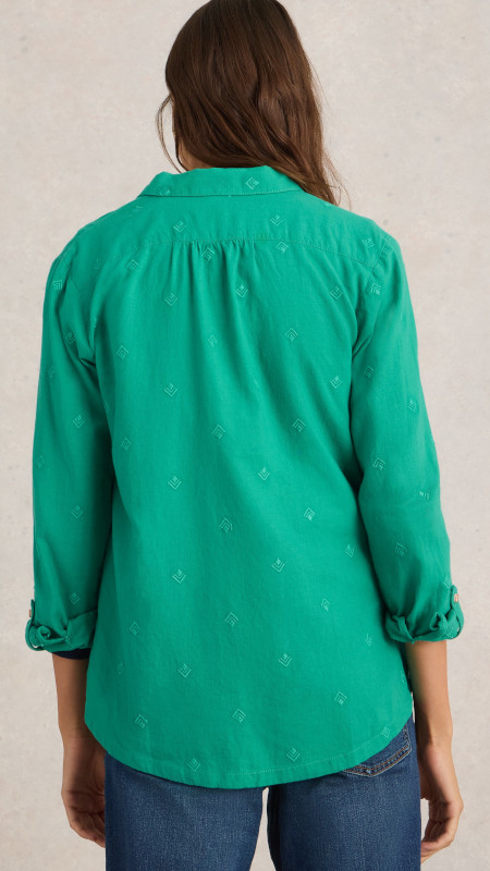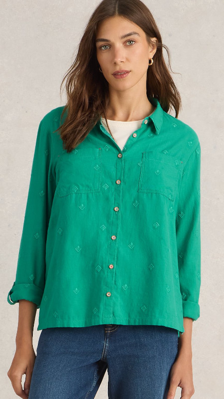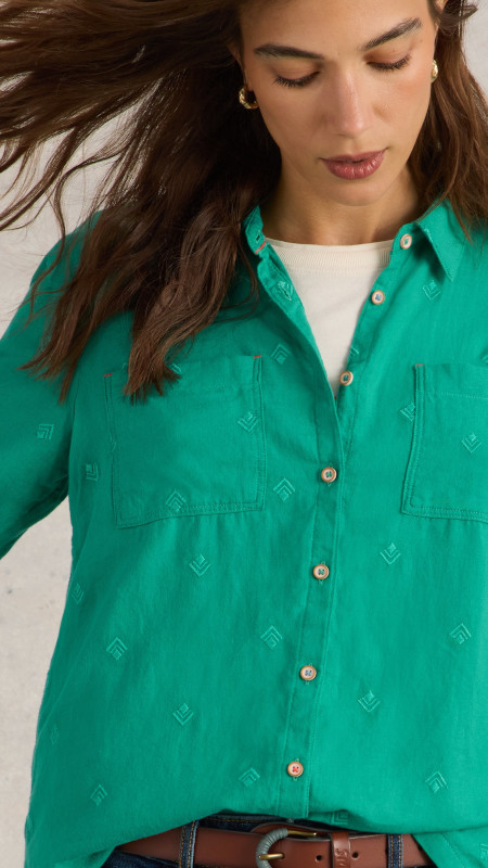 Smaragdgroene non-stretch White Stuff blouse met subtiel borduursel in dezelfde tint.