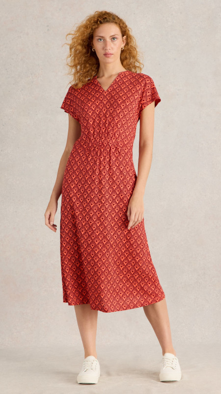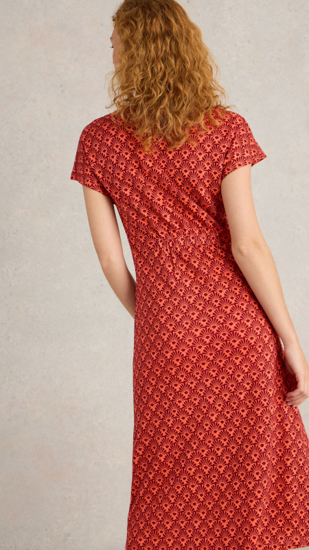 Vanuit de taille loopt de jurk wijder uit tot (ruim) over de knie (afhankelijk van je lengte).