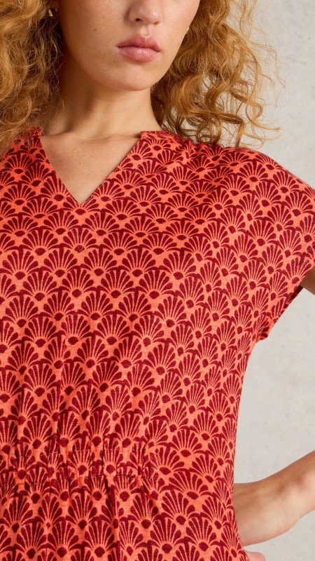 De jurk heeft een V-hals en een aangeknipt kort mouwtje, een klein stukje elastiek in de taille aan de voor- en achterzijde en steekzakken.