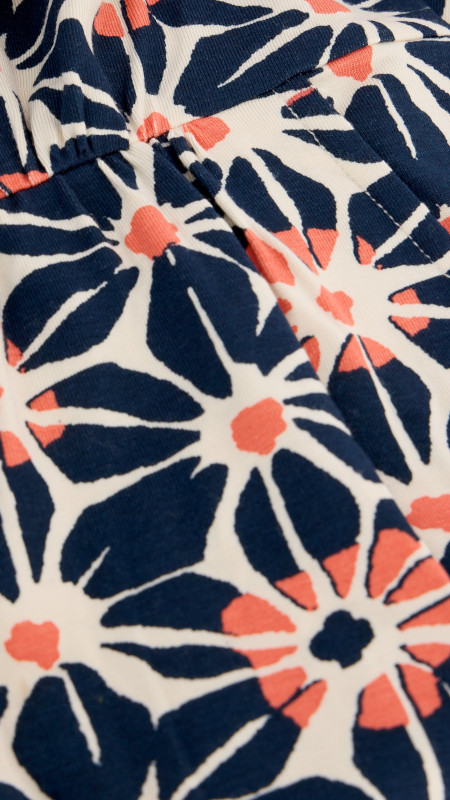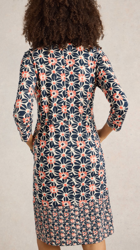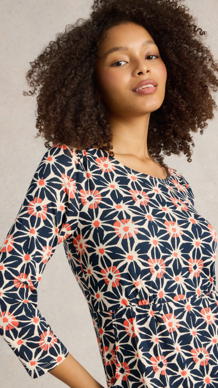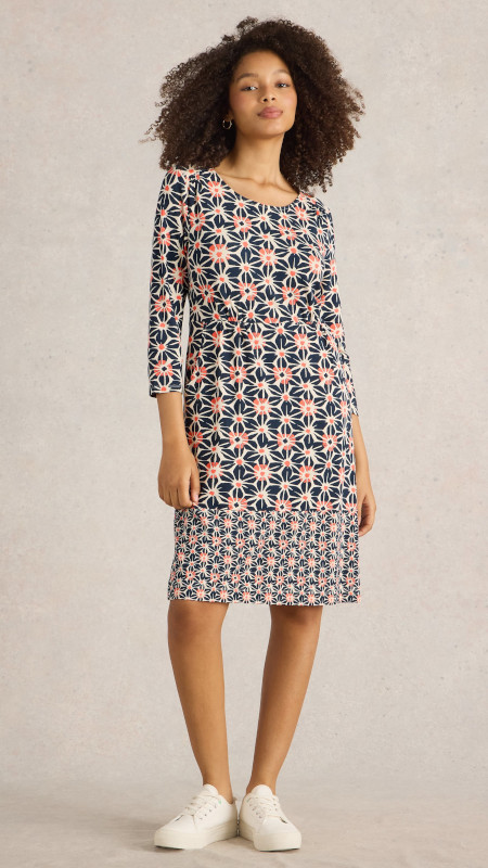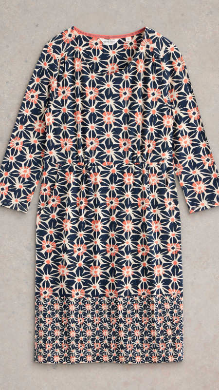 Donkerblauwe White Stuff jurk met print in offwhite en peach.