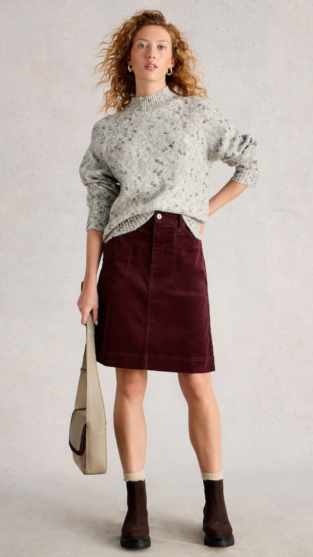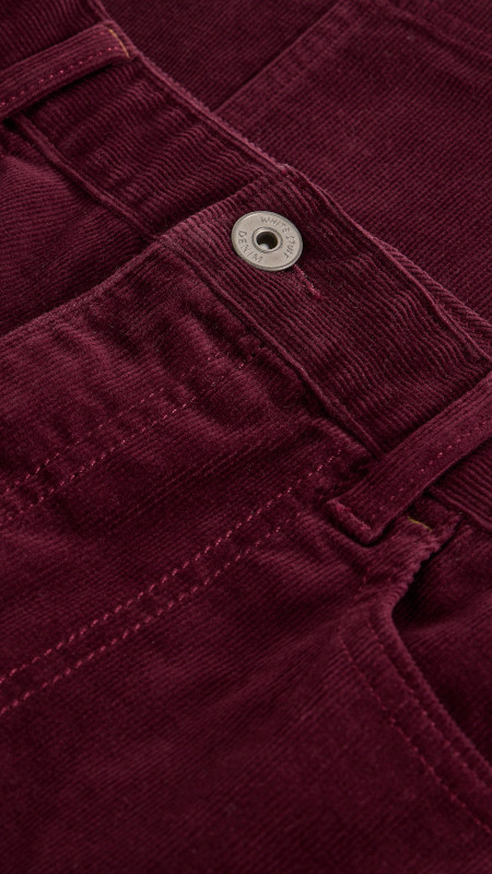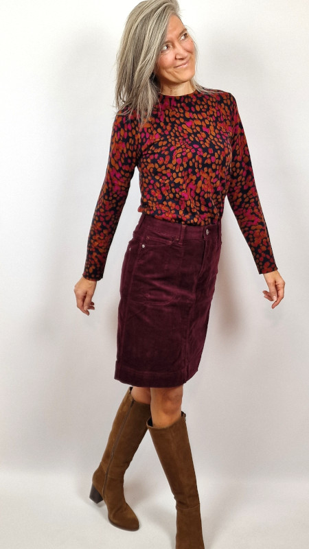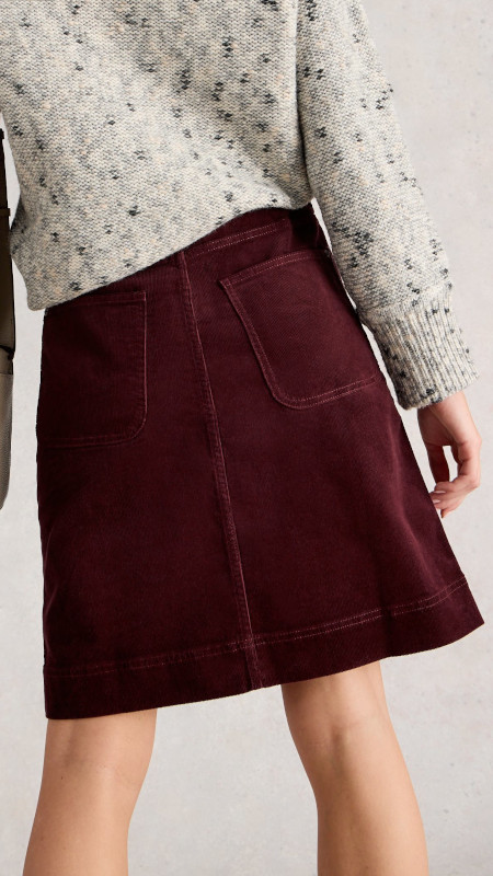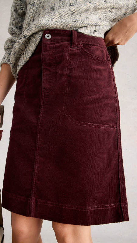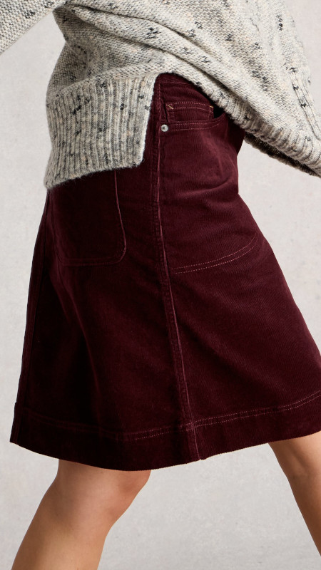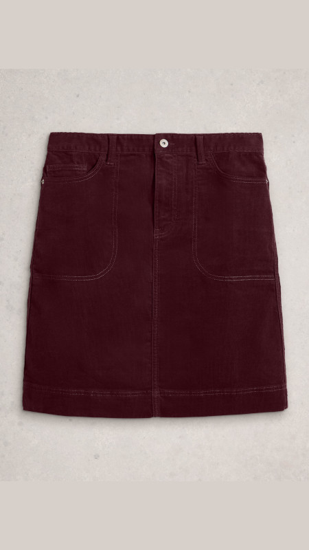 Bordeauxrood corduroy White Stuff rok in heel licht gerend model.