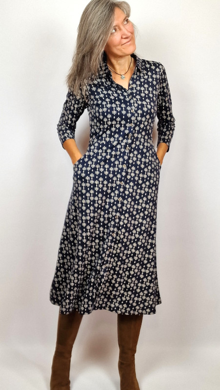 Prachtige jurk met een kraagje, knopen over de gehele lengte, driekwart mouwen, steekzakken en een wijd uitlopend rokgedeelte tot over de knie.