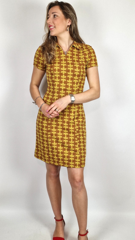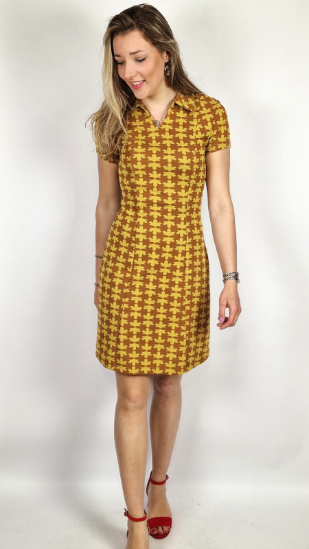 De jurk heeft een kraag met kleine V en korte mouwtjes.