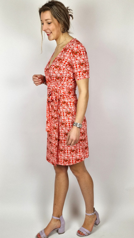 Dit is een wikkeljurkje waarbij de overslag is vastgestikt dus geen open waaiende rok.