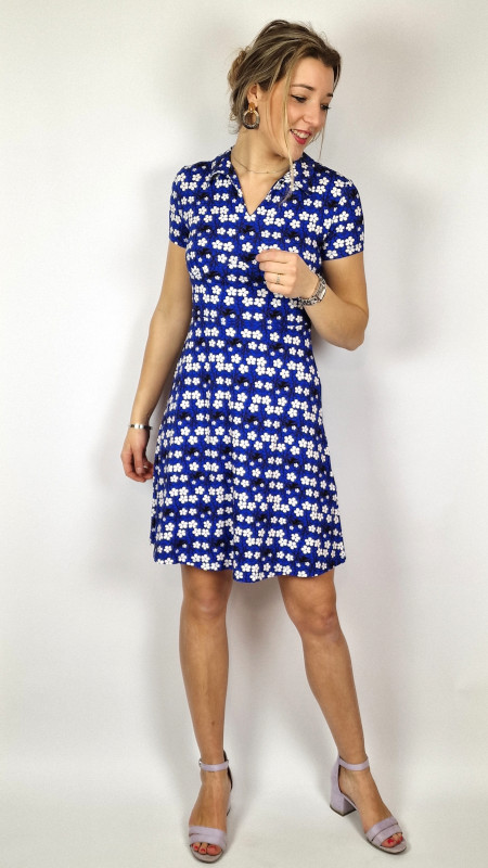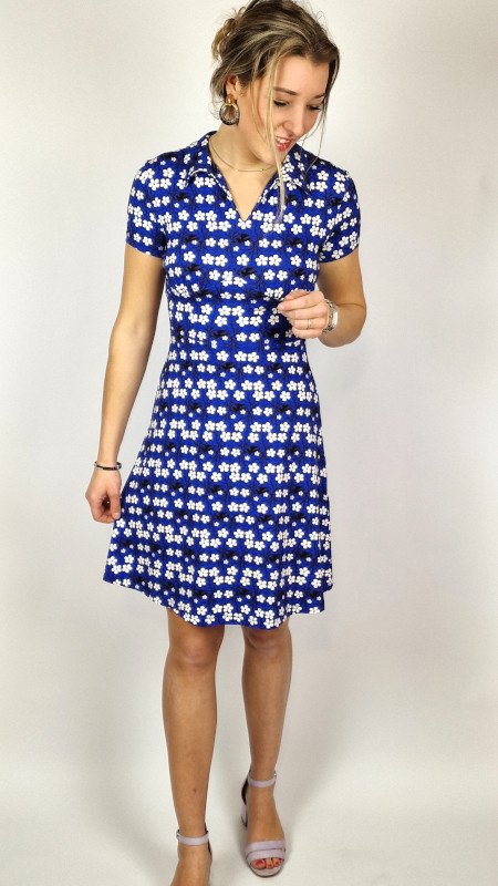 De jurk heeft een kraagje met een V en korte mouwtjes.