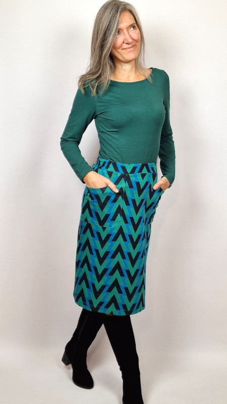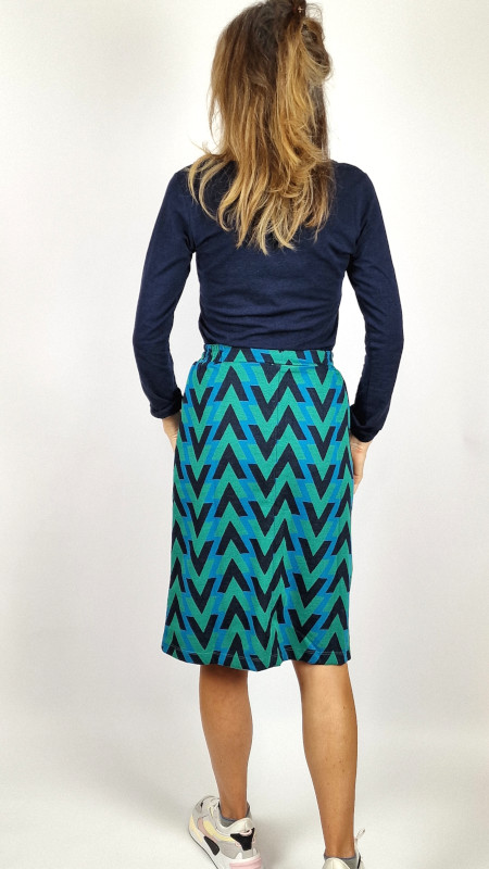 Groene WTG rok met print in donker- en lichtblauw.