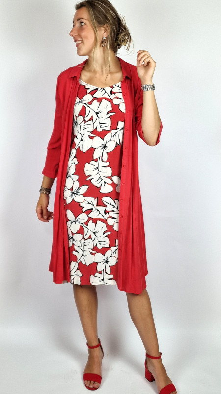 Je kunt de jurk ook los dragen over een andere jurk of over een broek. Dat staat superleuk en ook fijn als je op je werk liever een mouwtje draagt; de combinatie met de jurk Straps hawaii blossom is bijvoorbeeld prachtig (foto 2).