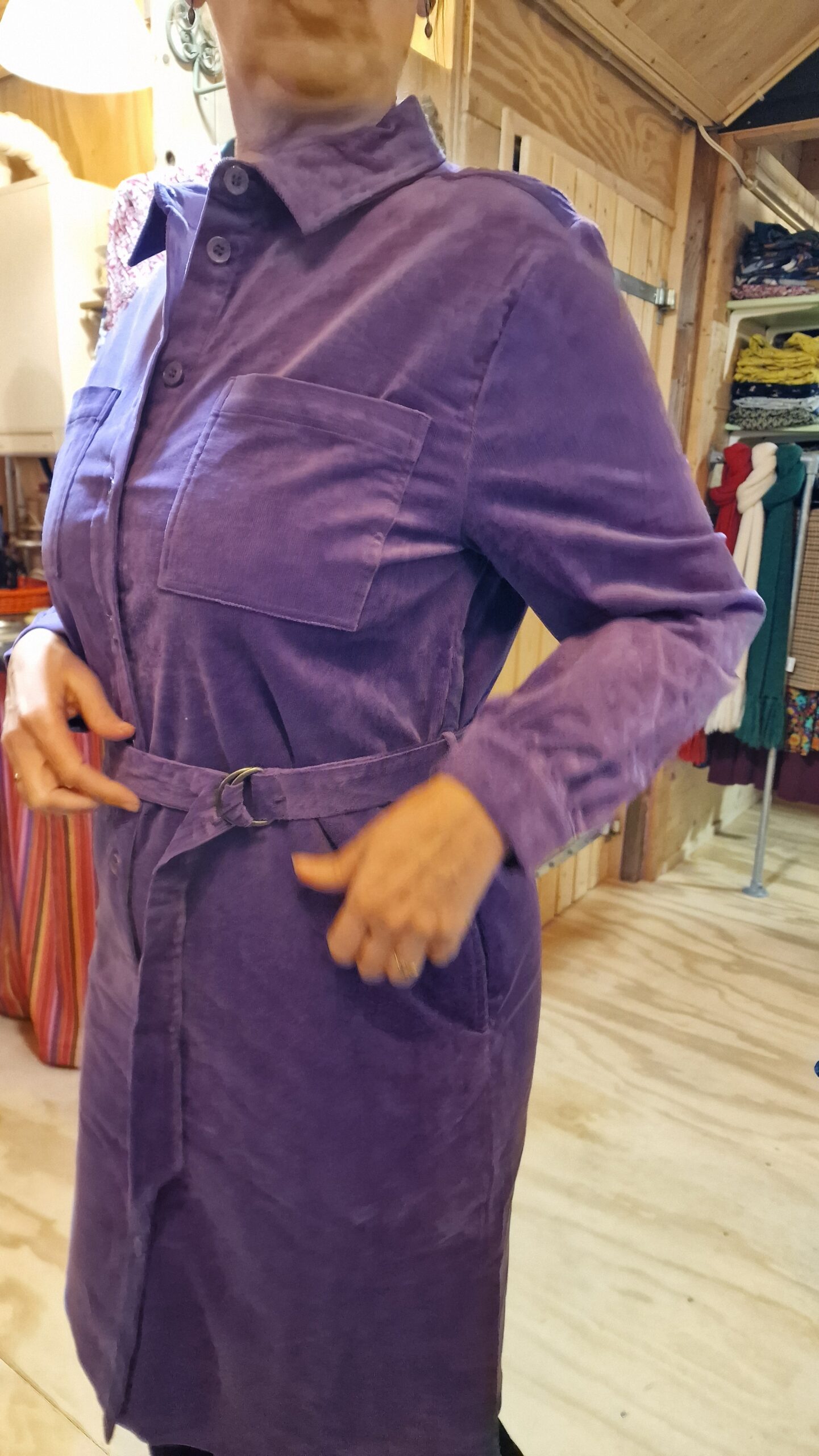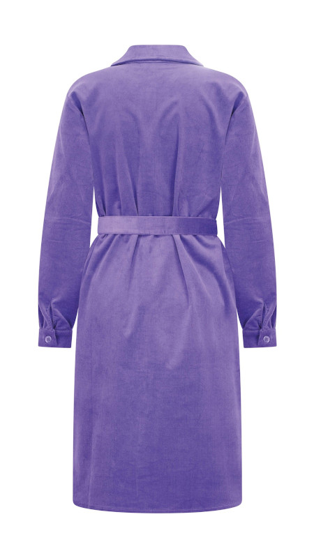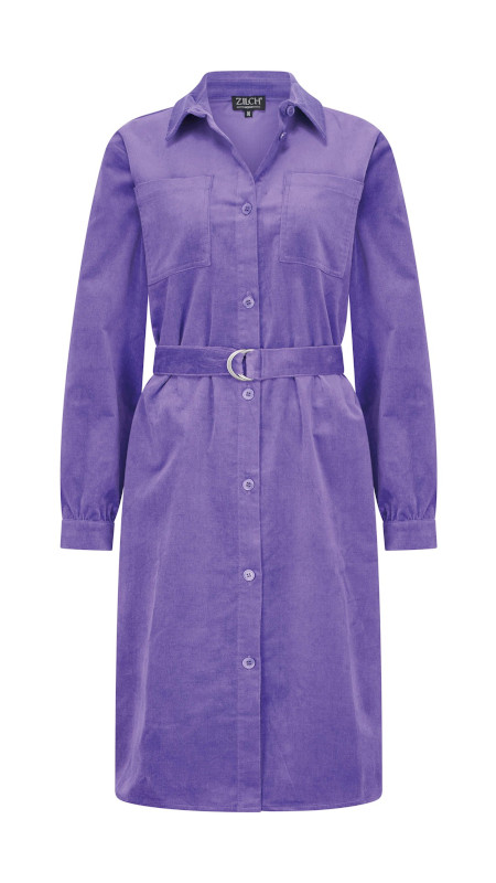 Helder paarse corduroy ZILCH doorknoopjurk met kraag, lange mouwen en een ceintuur in de taille.