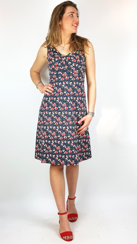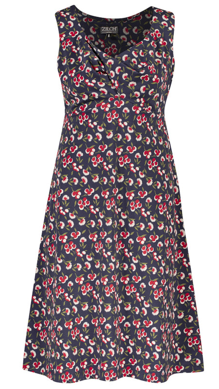 Blauwe mouwloze ZILCH jurk met print in rood, groen en offwhite.