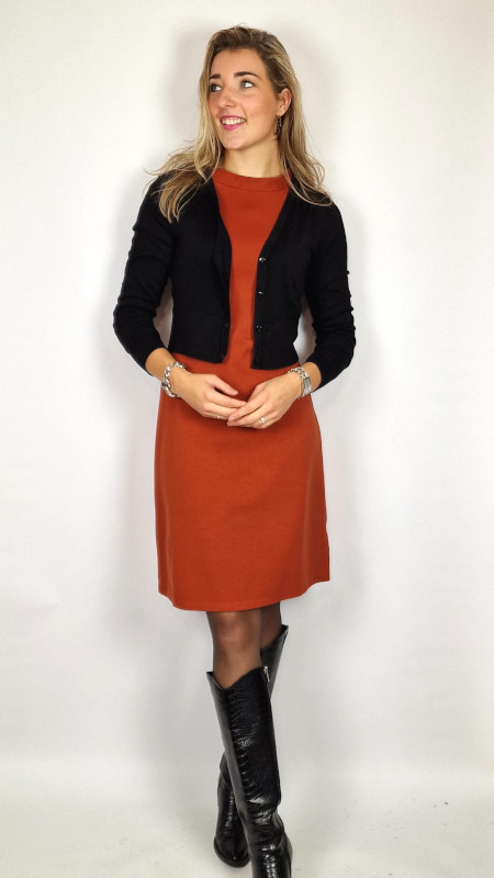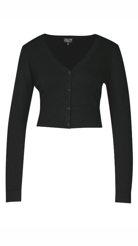 Dit vestje heeft een V-hals, lange mouwen en sluit met knoopjes in de kleur van het vestje.